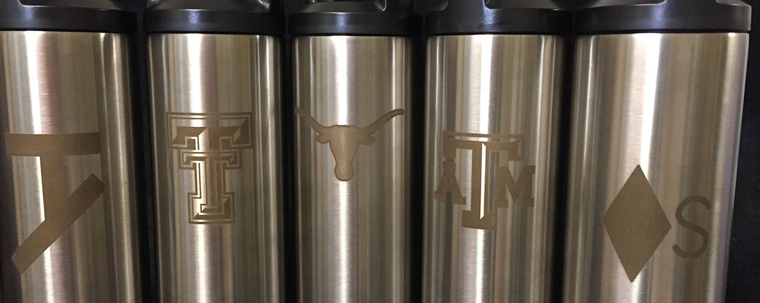 We can custom laser engrave your tumbler or glassware to add a beautiful logo or any other artwork all the way around the cup using our CNC Laser etching machine with a rotary axis to accurately engrave the surface covering the entire circumference of the cup.